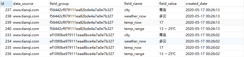 select t1.data_source,        t1.field_group,        t1.created_date,        t1.field_value as city,        t2.field_value as weather_now,        t3.field_value as temp_now,        t4.field_value as temp_range from crawled_data1 t1 left join crawled_data1 t2 on t1.field_group = t2.field_group and t2.field_name = 'weather_now' left join crawled_data1 t3 on t1.field_group = t3.field_group and t3.field_name = 'temp_now' left join crawled_data1 t4 on t1.field_group = t4.field_group and t4.field_name = 'temp_range' where 1 = 1       and t1.data_source = 'www.tianqi.com'       and t1.field_name = 'city' order by t1.created_date desc;  |