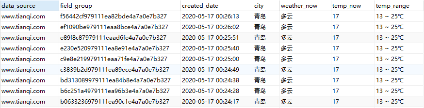 select * from crawled_data1 t1 where 1 = 1       and t1.data_source = 'www.tianqi.com' order by t1.created_date desc,t1.id;  |